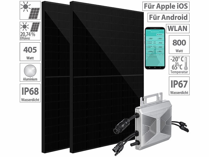 • Quick plug-in setup: grid-compliant micro-inverter feeds solar power into your home network via a standard socket.