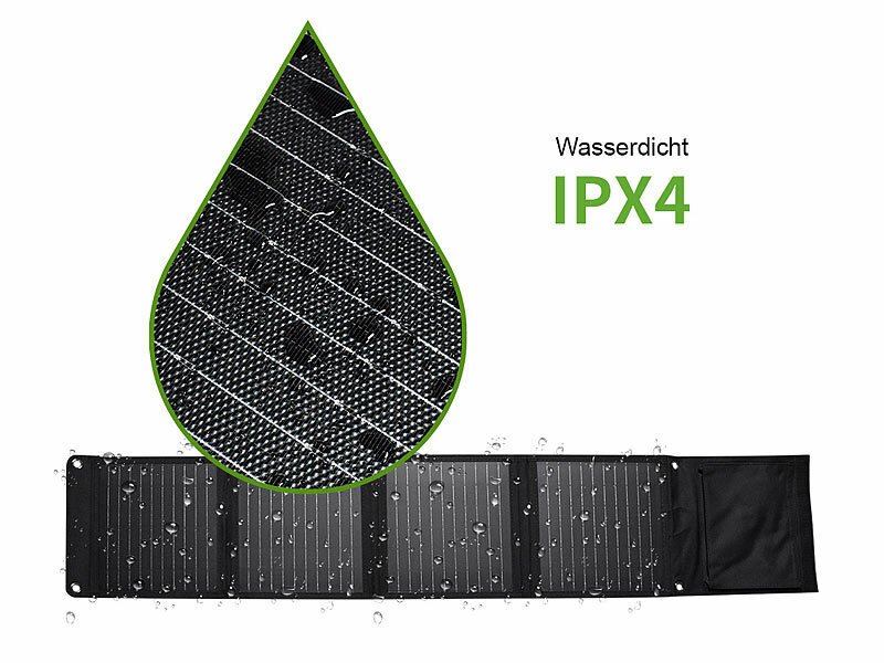 Foldable solar charger with USB-A & USB-C outputs and IPX4 splash protection—ideal for outdoor adventures and travel.